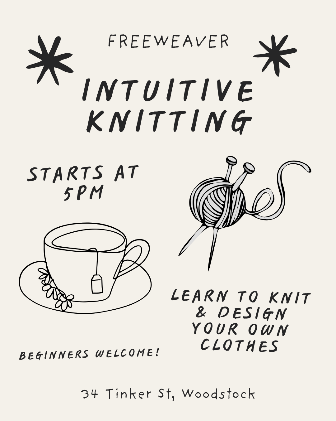 All levels are welcome. We will cover the basics of knitting, choosing yarn and needles, knitting swatches and designing garments ranging from simple scarves up to sweaters and beyond.